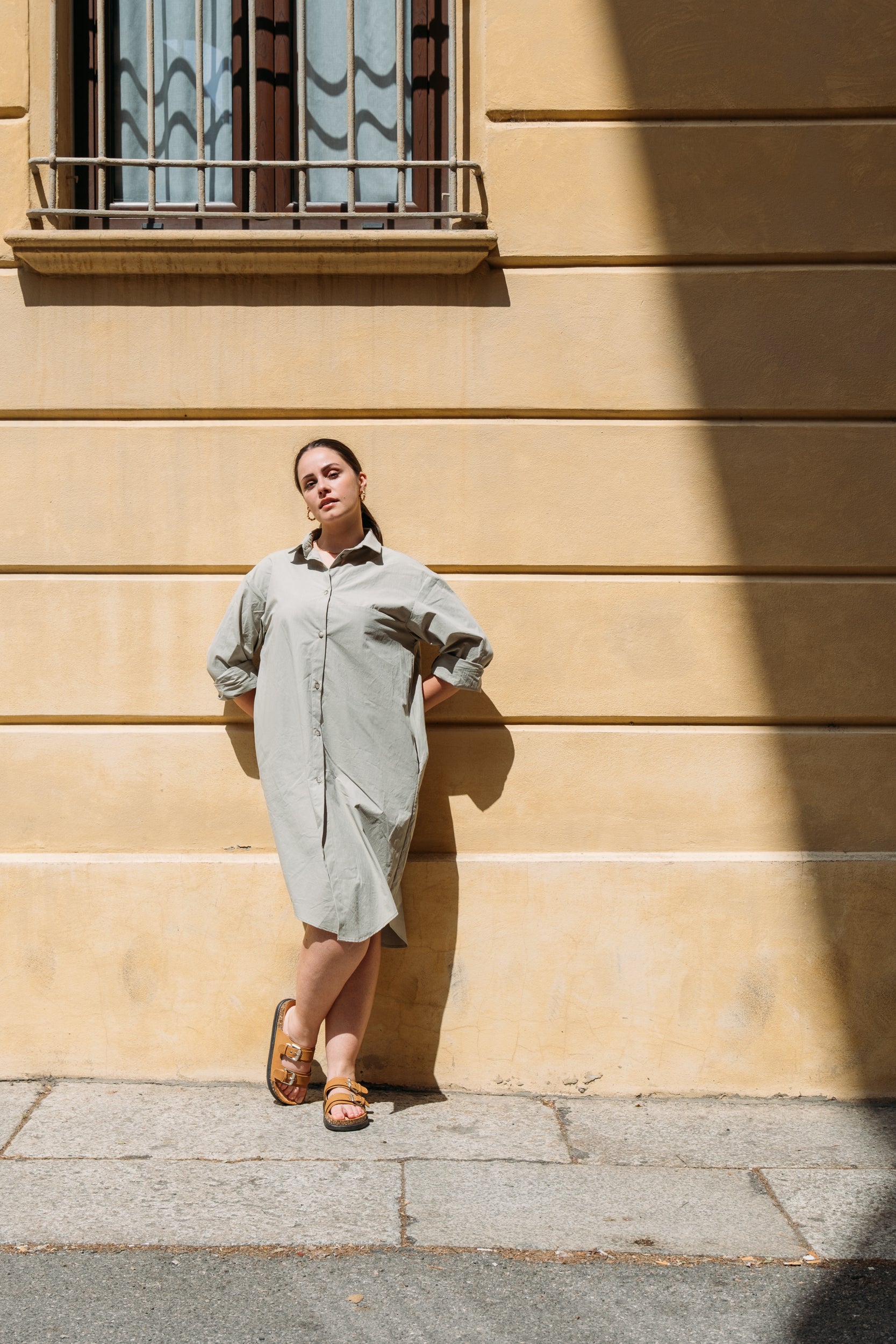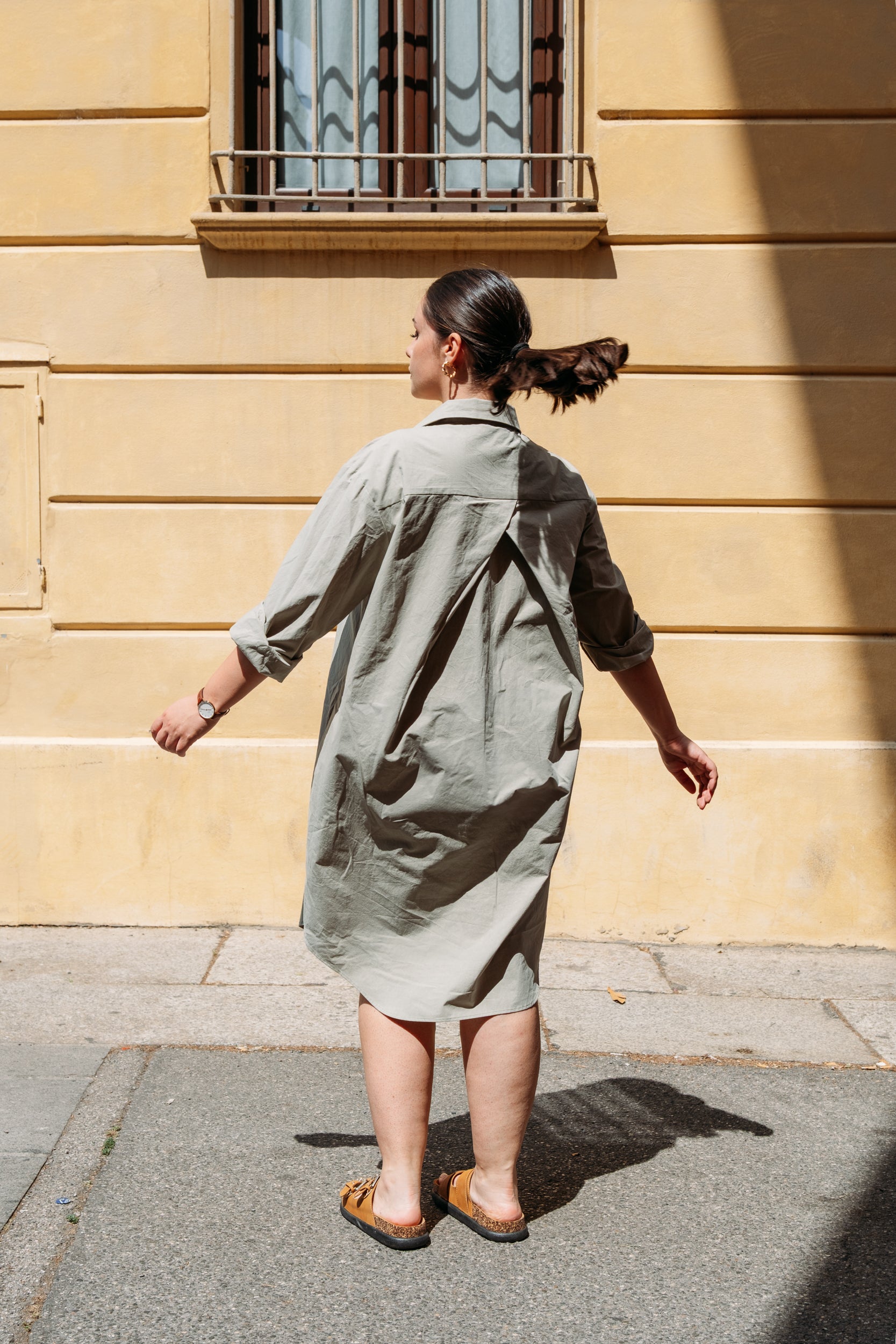 A fresh Dew green oversized shirt dress crafted in 100% cotton, featuring a signature cross-back and convenient hidden side pockets.
