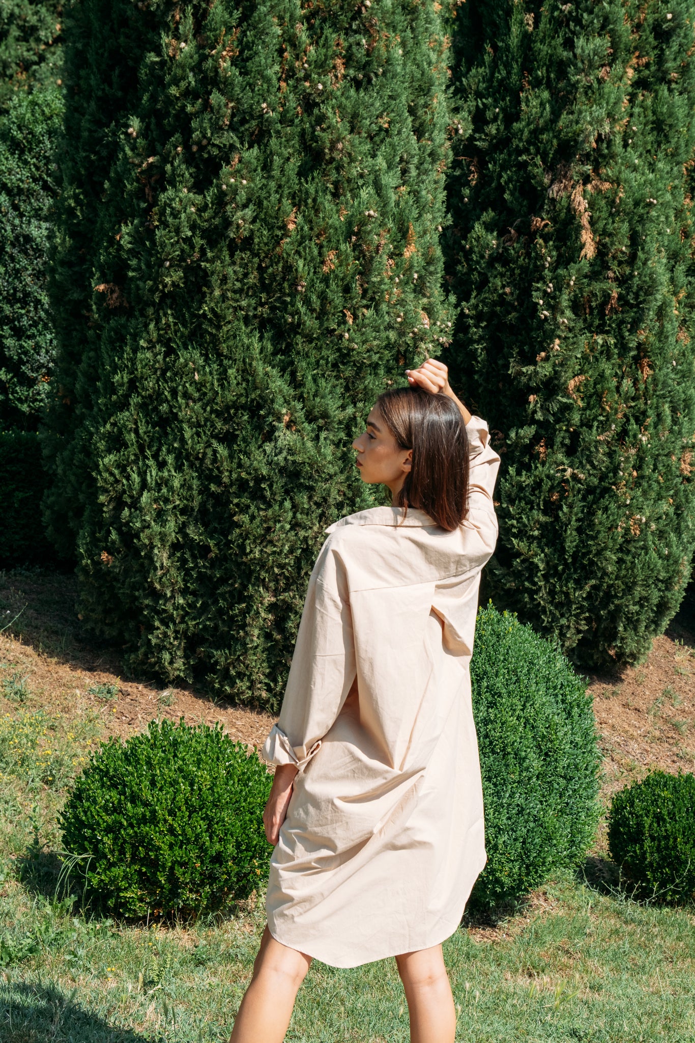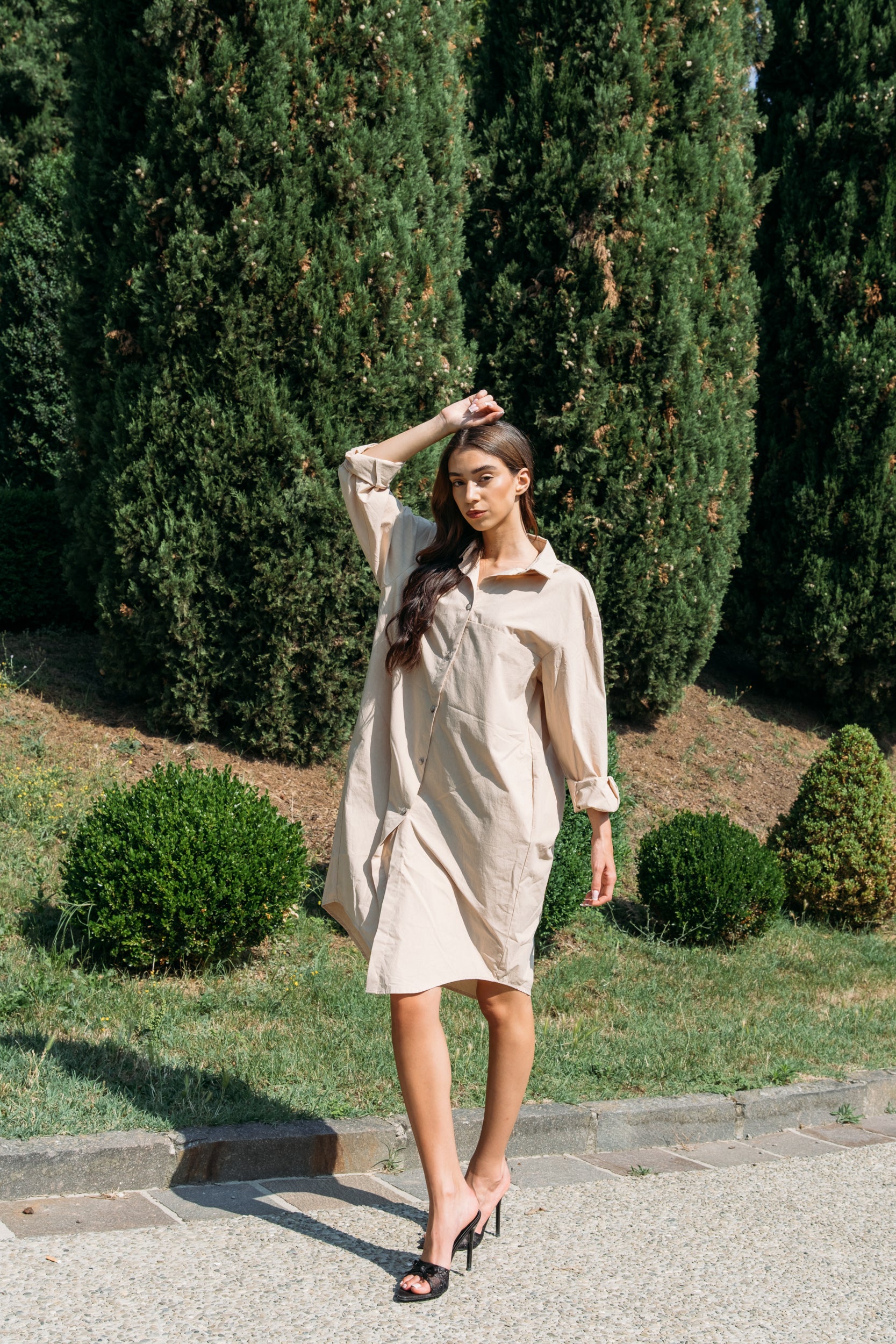 This Shortbread cream cotton shirt dress combines an oversized, effortless fit with the functional elegance of hidden side pockets.