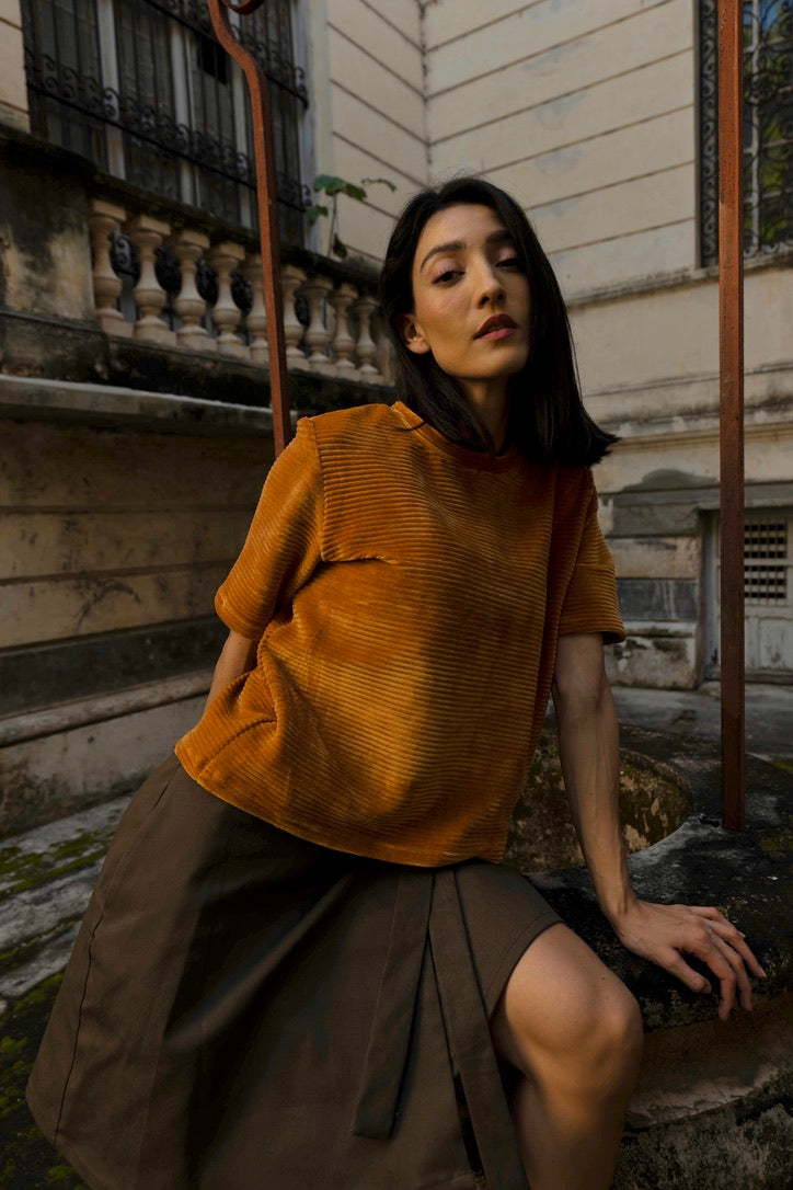 The Tofino T-shirt: an essential short-sleeve top for AW25. Crafted from luxurious ribbed velvet, it offers refined comfort and effortless versatility for your curated wardrobe.