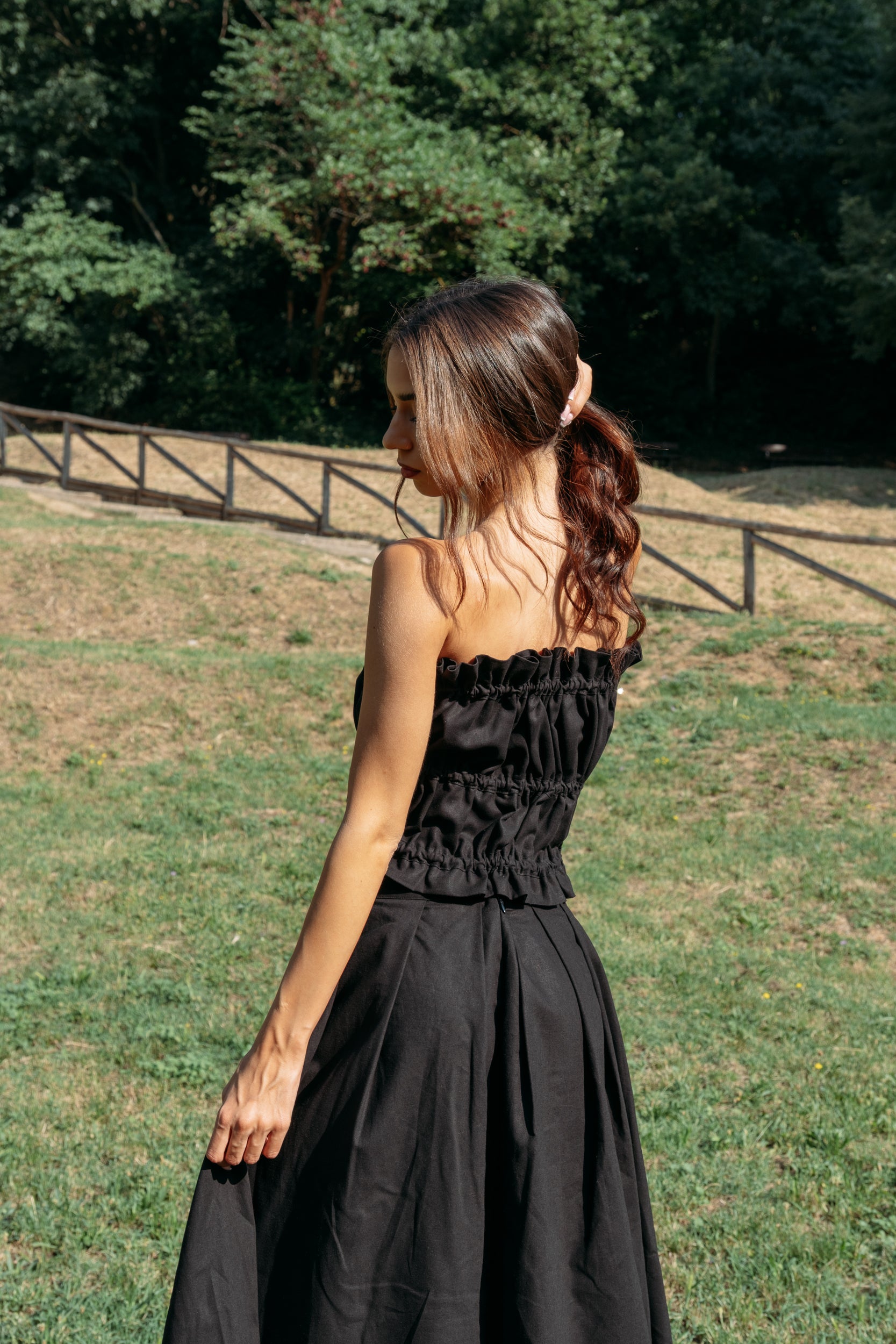 A sophisticated Pepper black strapless top in a premium linen-cotton blend, featuring a signature three-tiered drawstring system for a custom, architectural fit.