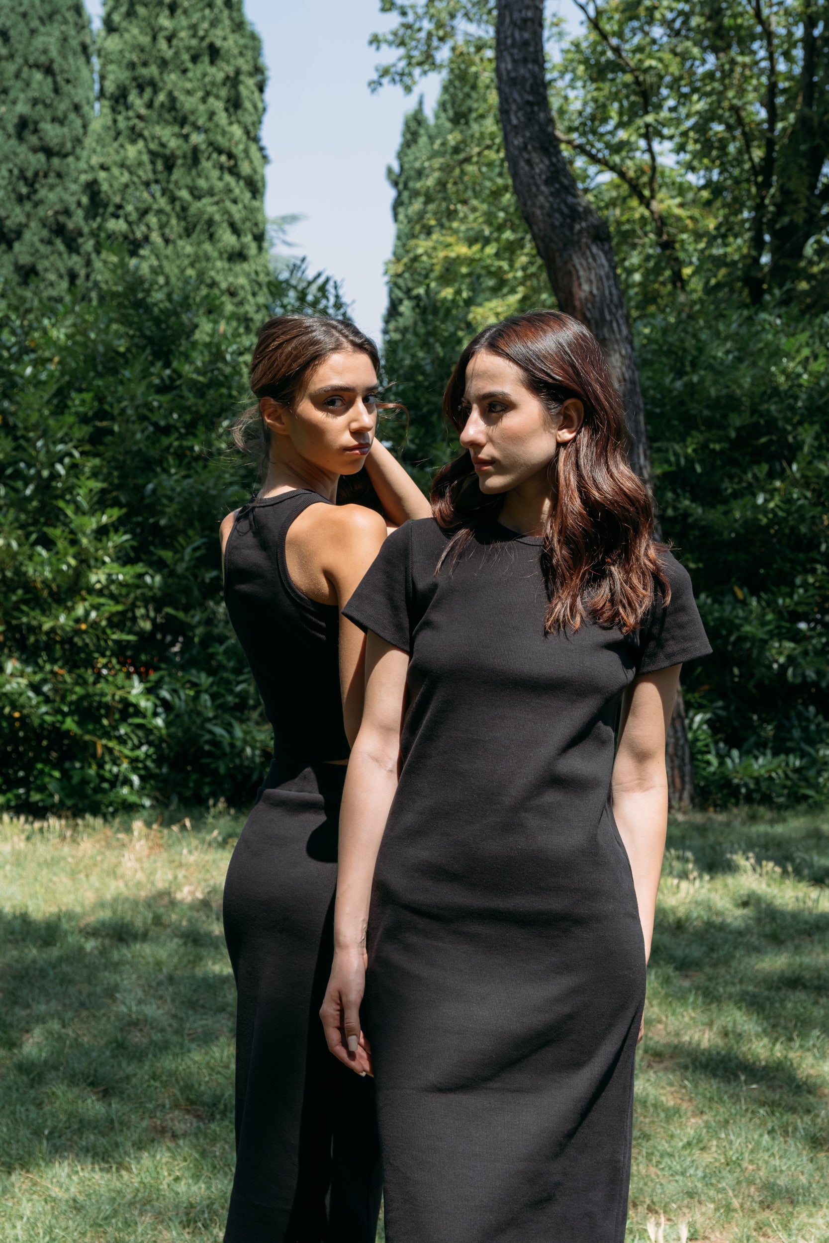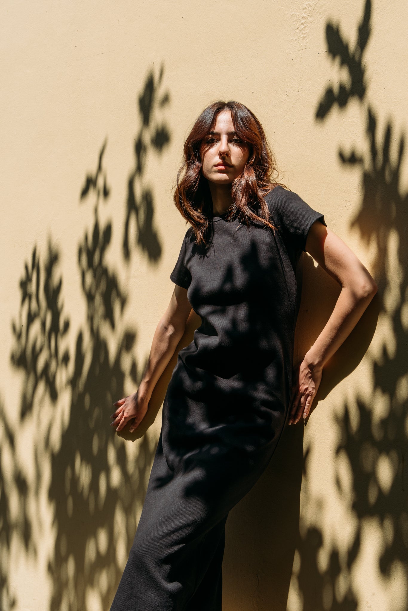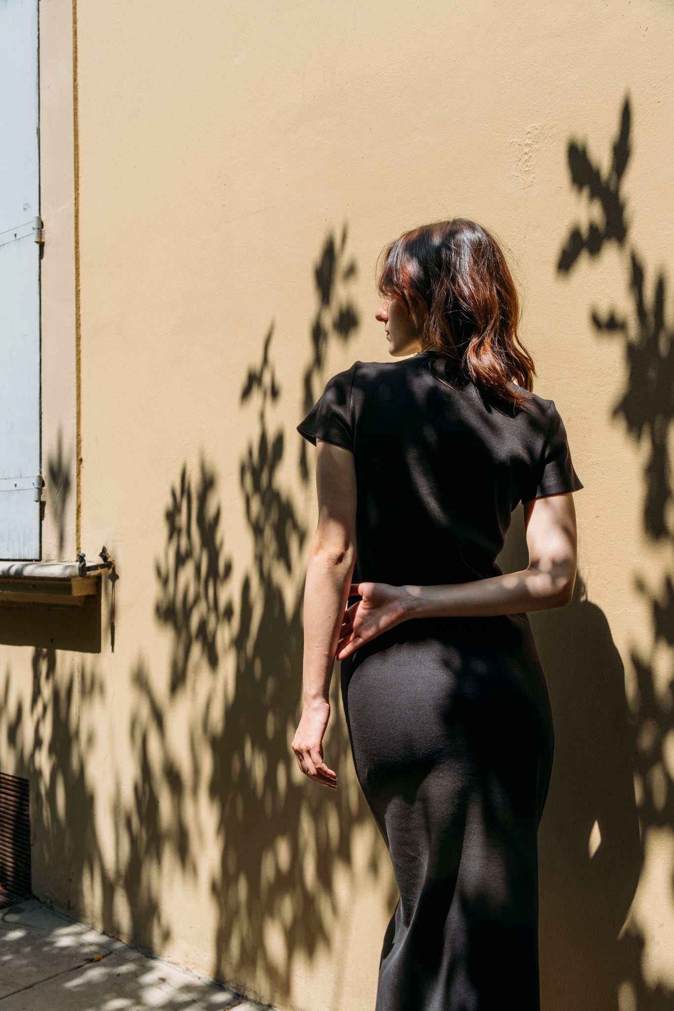 A sleek, Pepper black maxi-length T-shirt dress crafted in our signature supportive rib for a sophisticated city look.