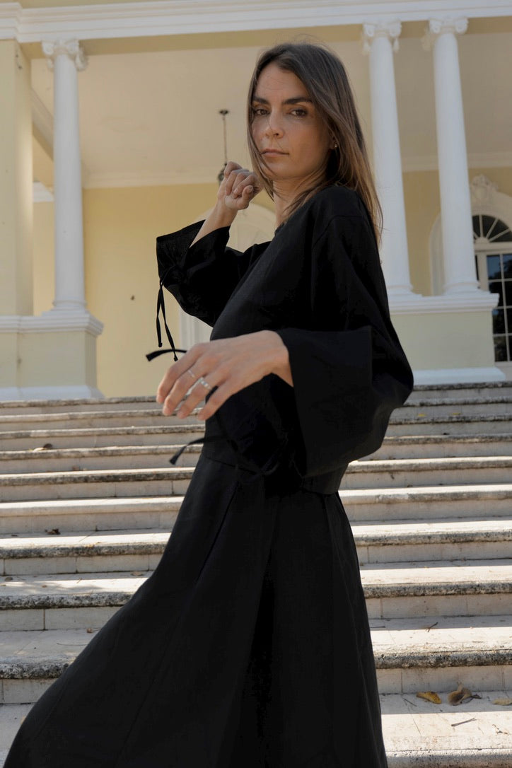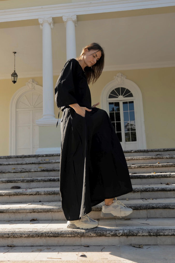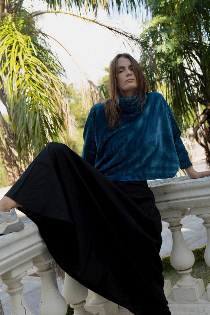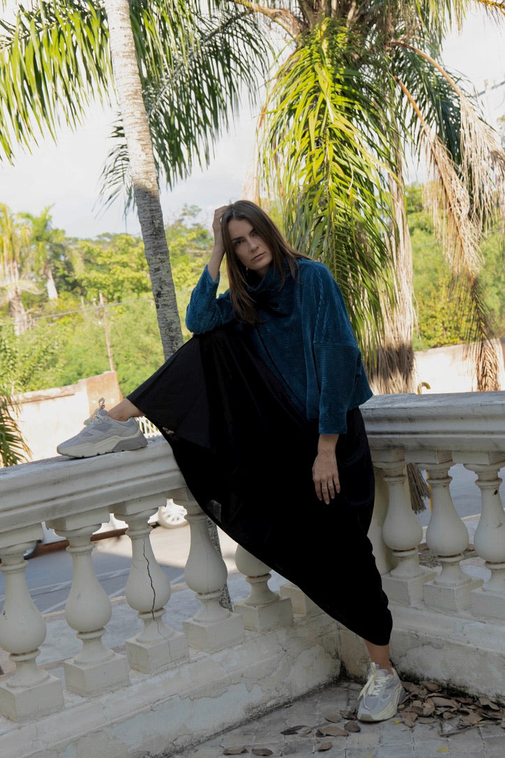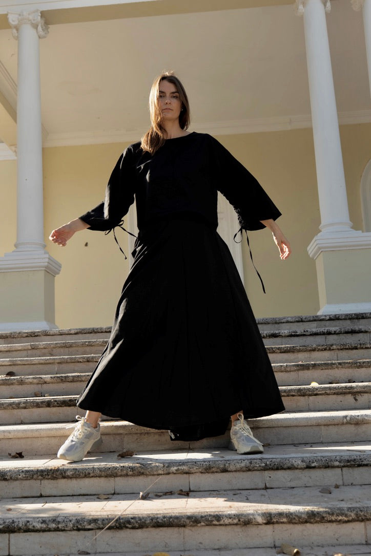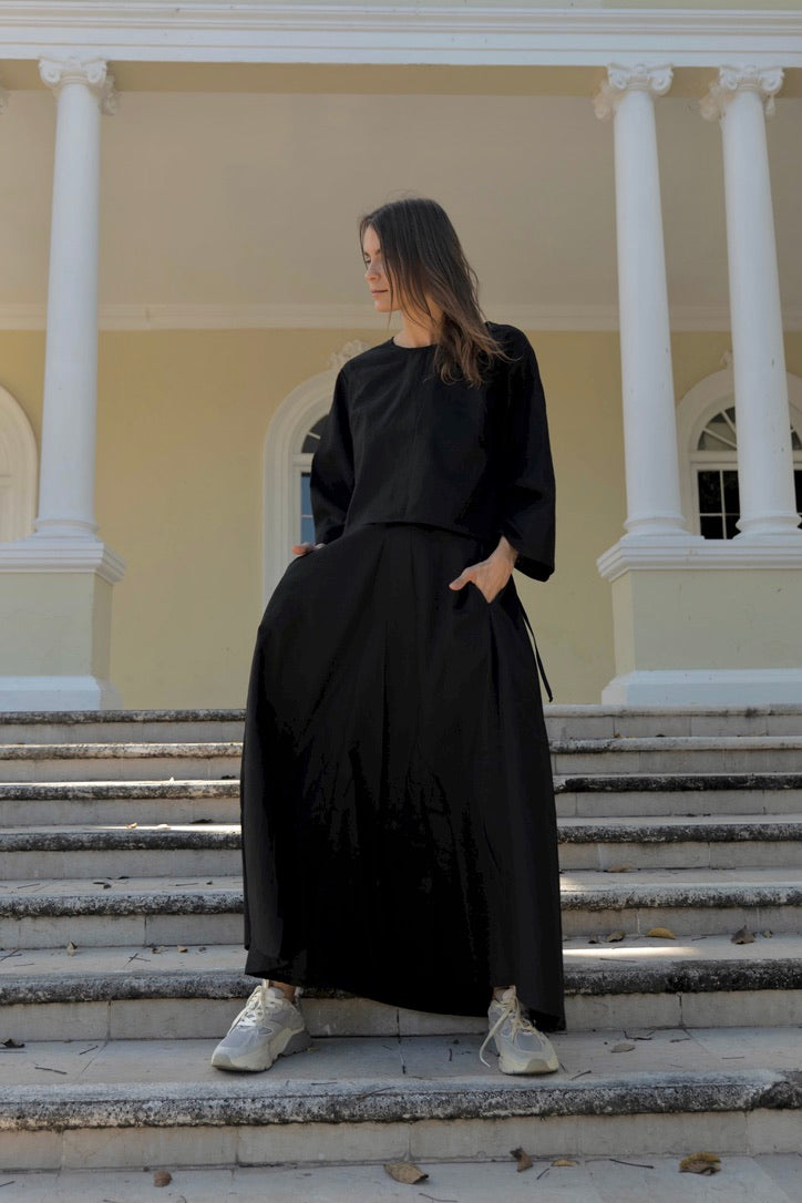La jupe Savannah : une jupe longue fluide et gracieuse pour l'automne-hiver 2025. Confectionnée dans un doux mélange lin-coton, elle présente d'élégants plis au dos et une fermeture éclair invisible pour un style sans effort.