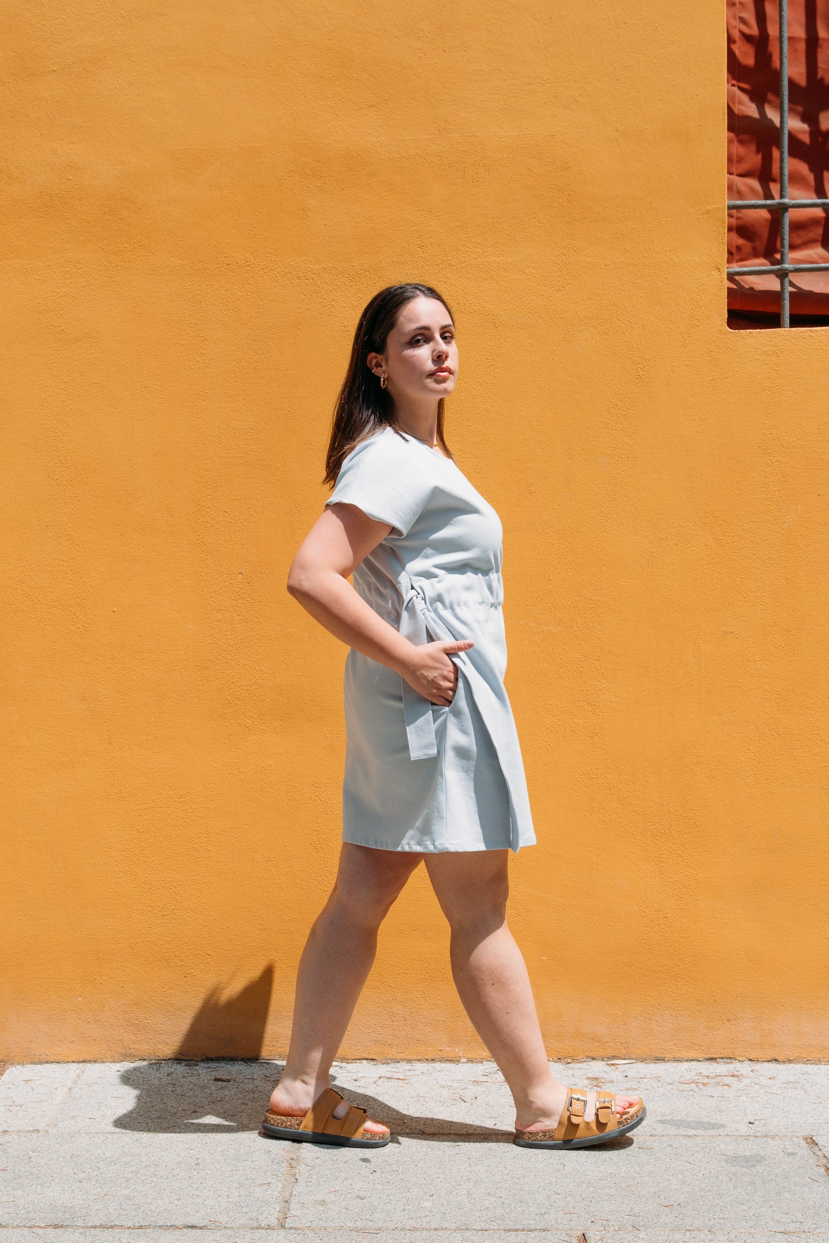 Une robe architecturale bleu poudré souple en twill stretch respirant, dotée d'une épaule tombante et d'une ceinture intérieure polyvalente.