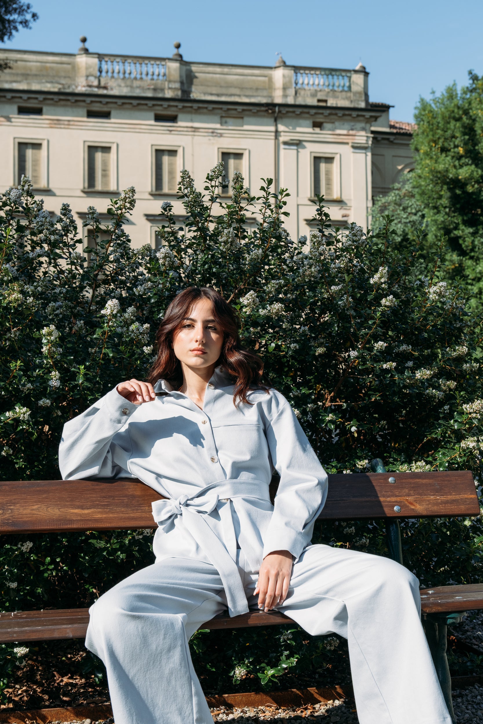 Un pantalon bleu poudré doux en sergé stretch respirant qui allie structure architecturale et confort sans effort, épousant les courbes.
