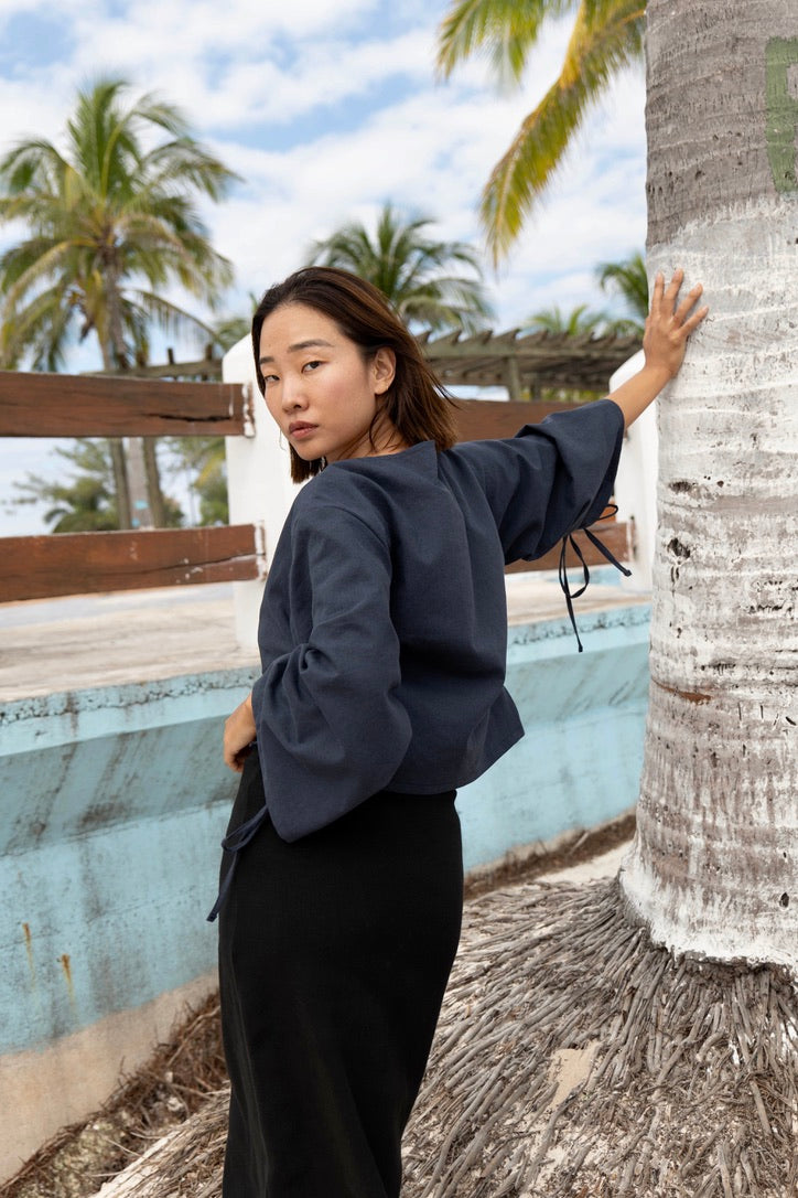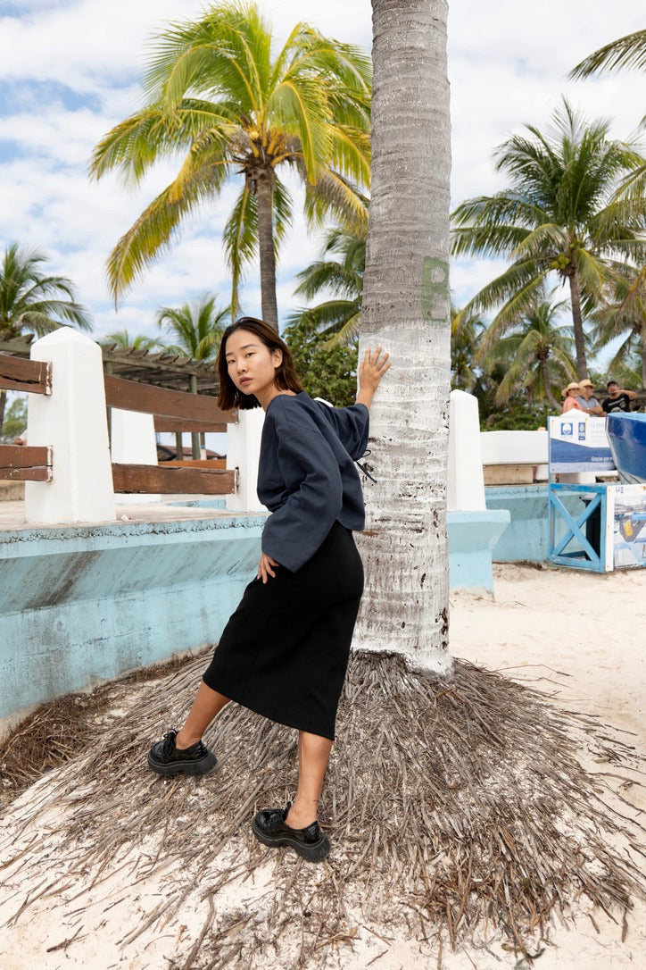 The Cartagena Skirt: your essential bodycon midi skirt for SS25. Crafted from a luxurious stretchy rib cotton blend, it offers a flattering fit and endless styling possibilities for your curated wardrobe.