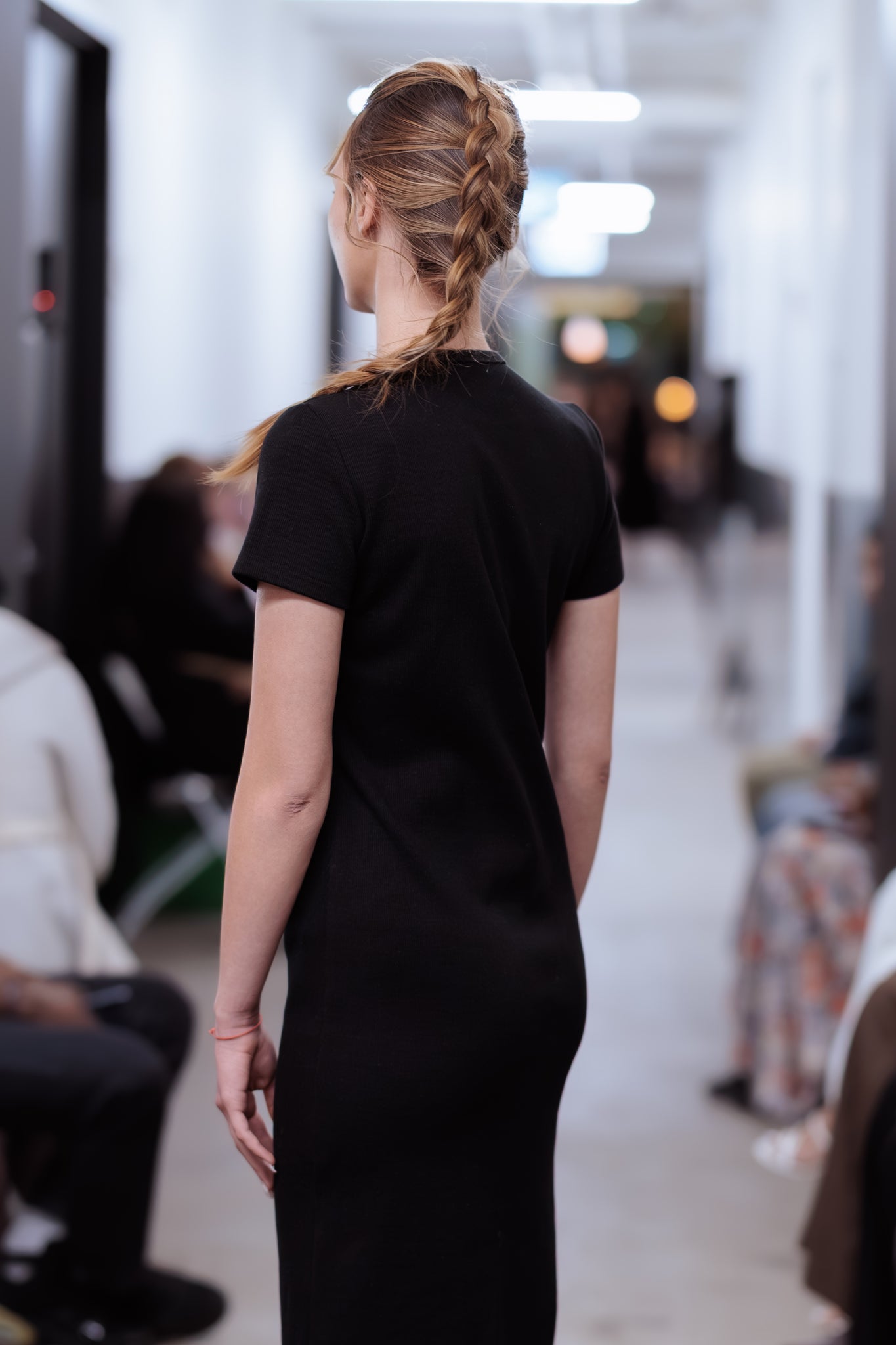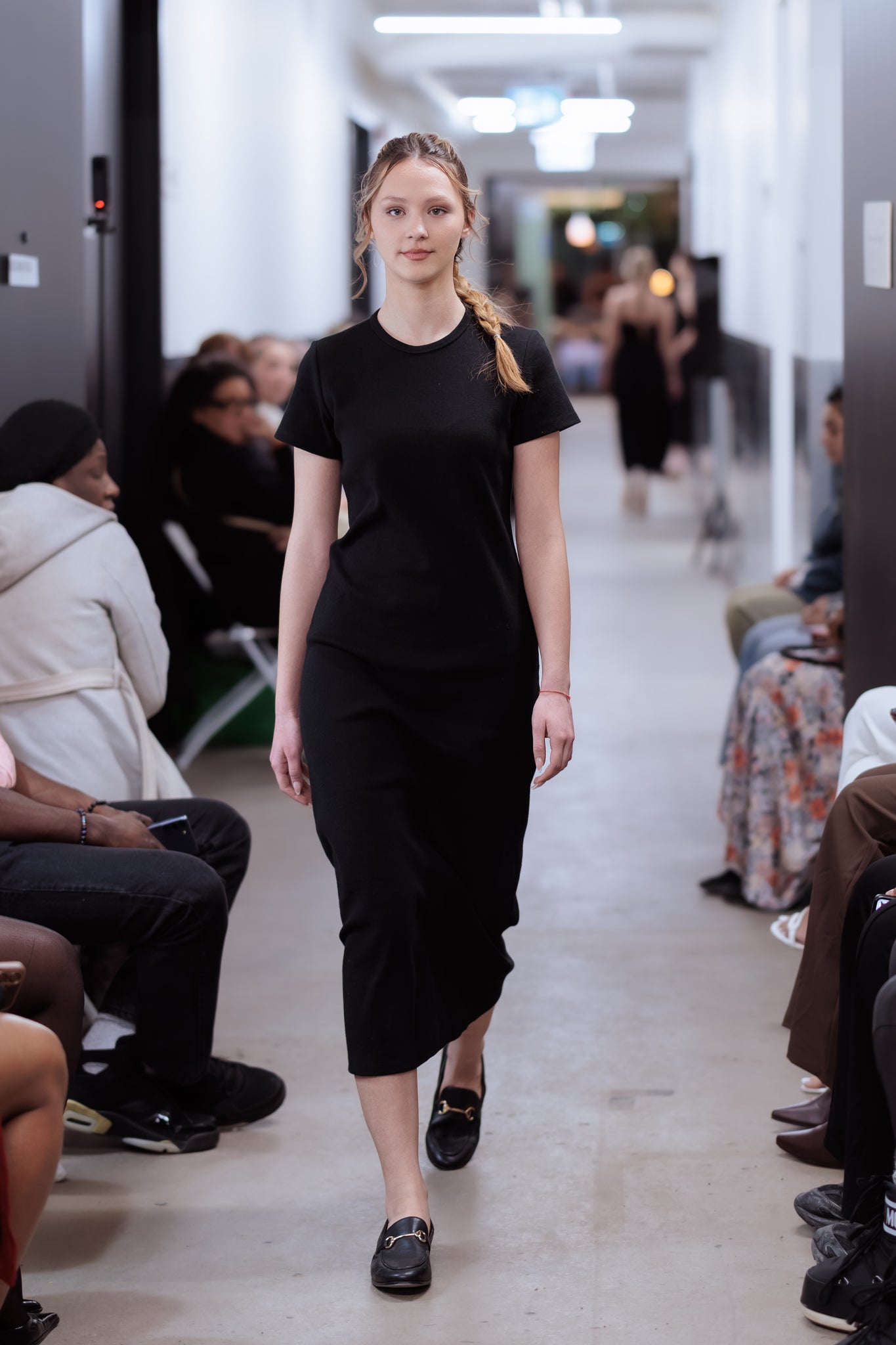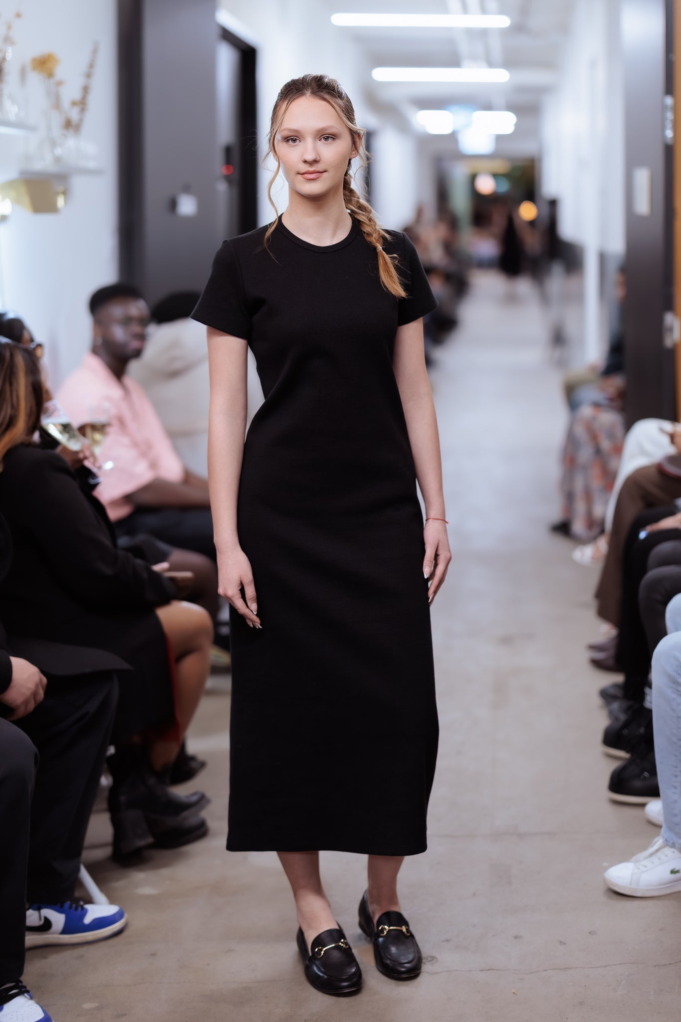 A sleek, Pepper black maxi-length T-shirt dress crafted in our signature supportive rib for a sophisticated city look.