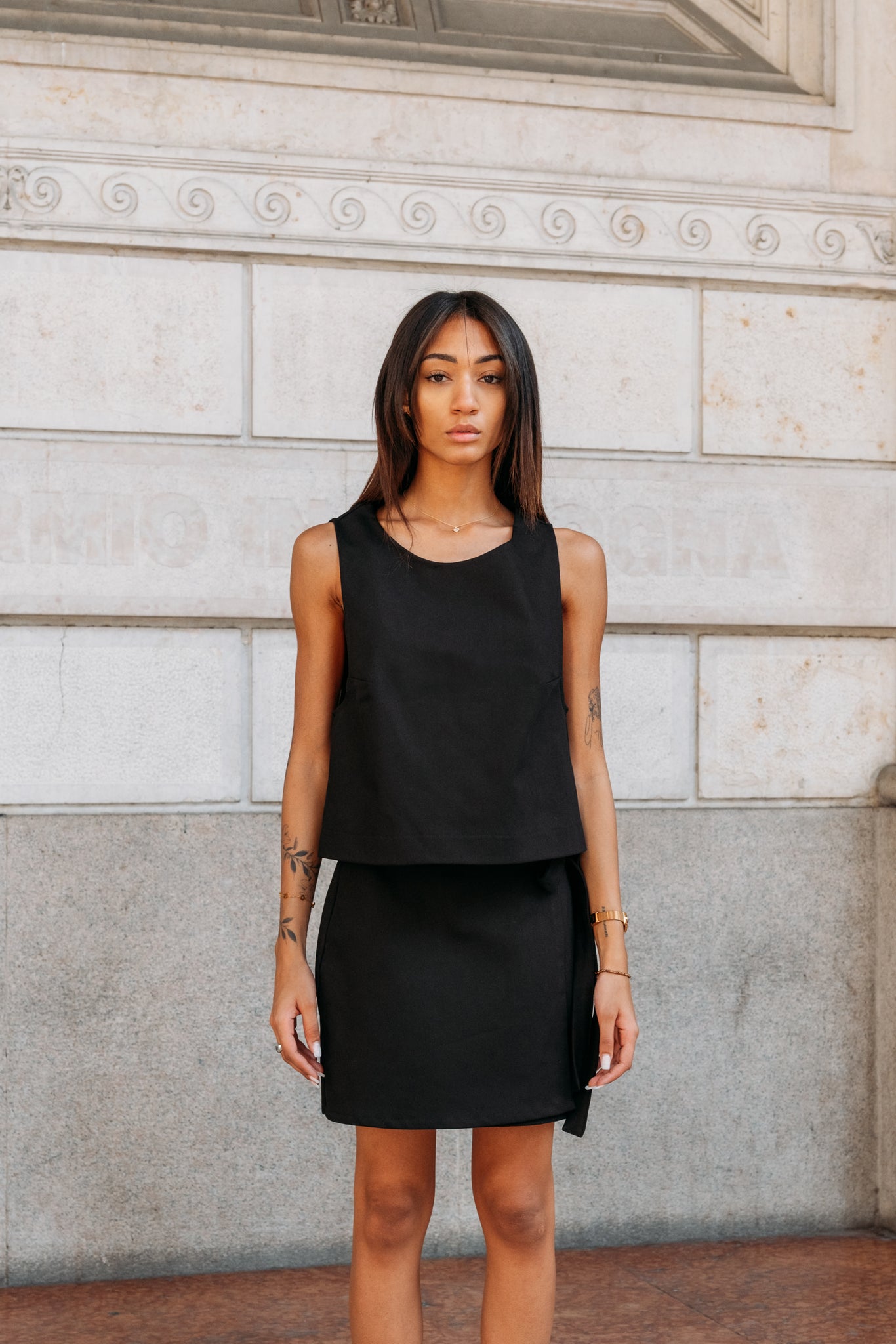 A structured, Pepper black tank top in premium stretch twill, featuring a clean, architectural cut for the modern professional.