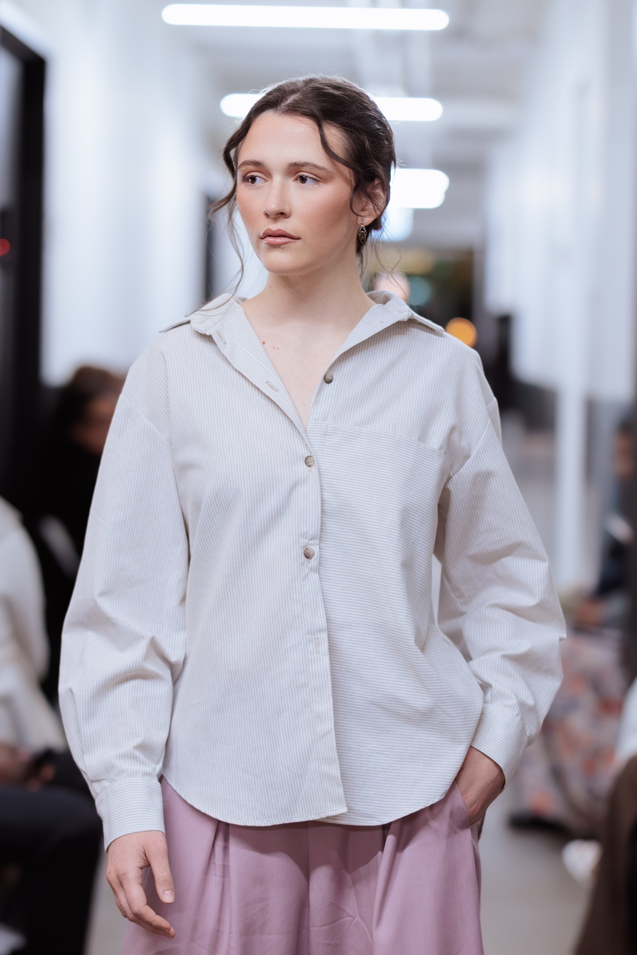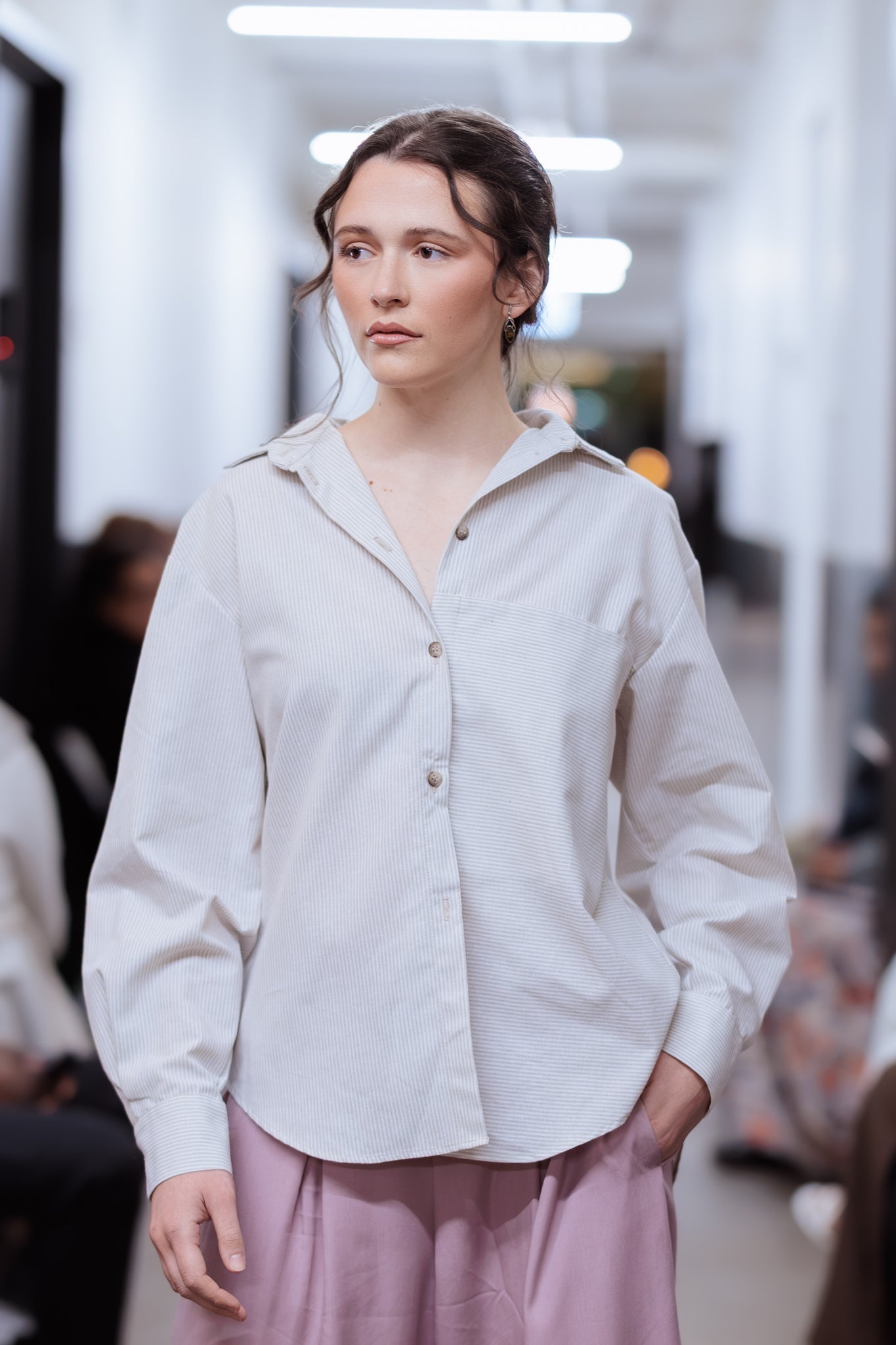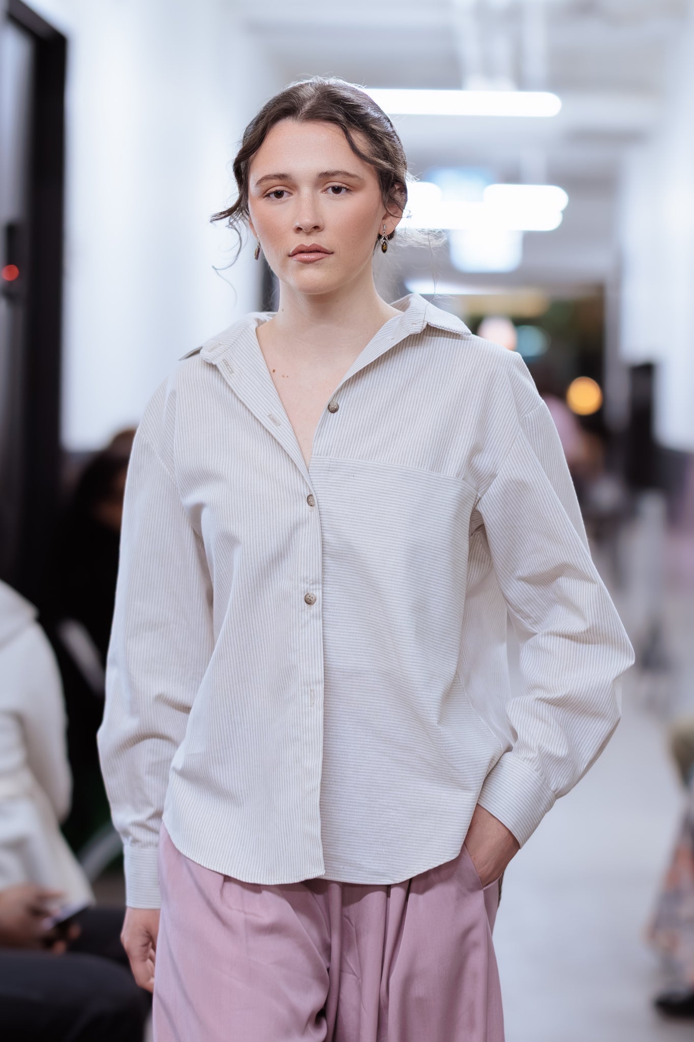 A striking striped linen-cotton blouse featuring dynamic changes in line direction for an artistic, architectural take on the classic button-up.