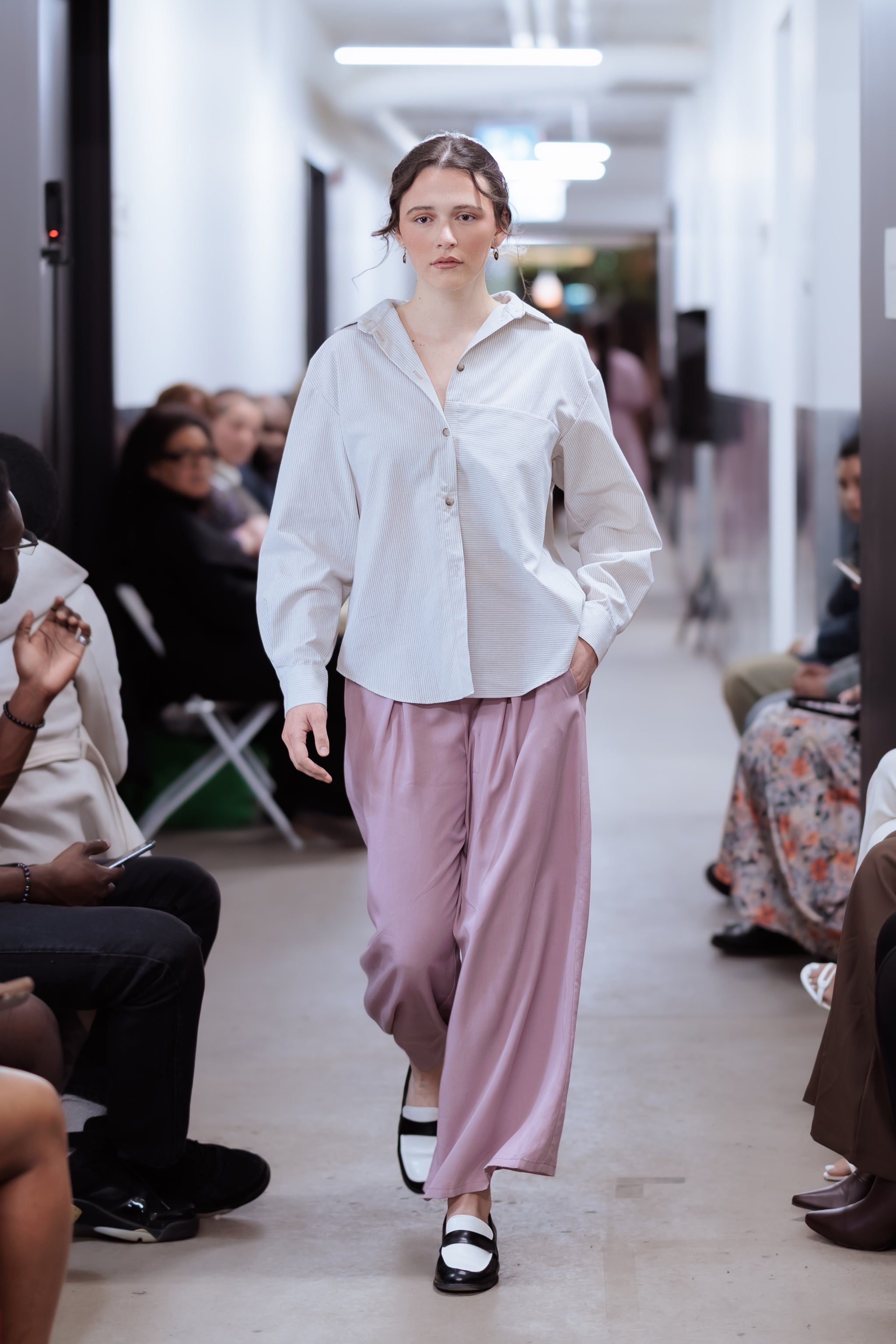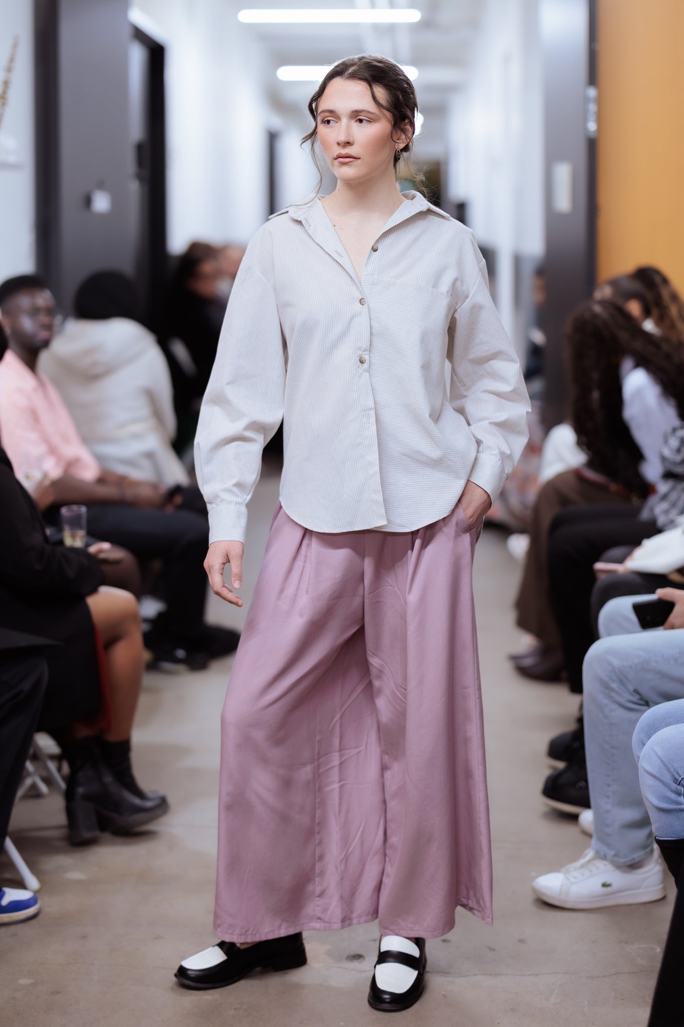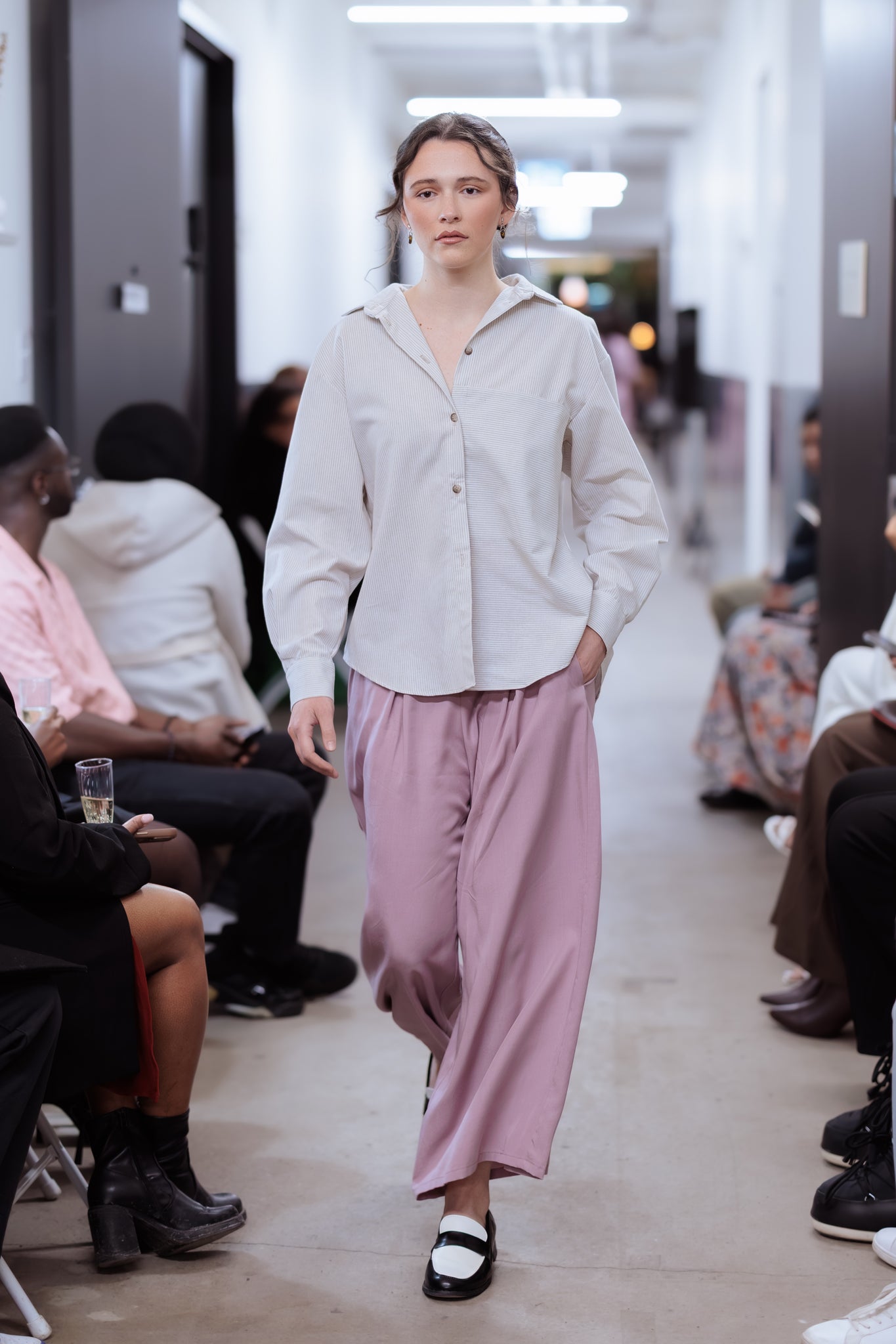 A striking striped linen-cotton blouse featuring dynamic changes in line direction for an artistic, architectural take on the classic button-up.