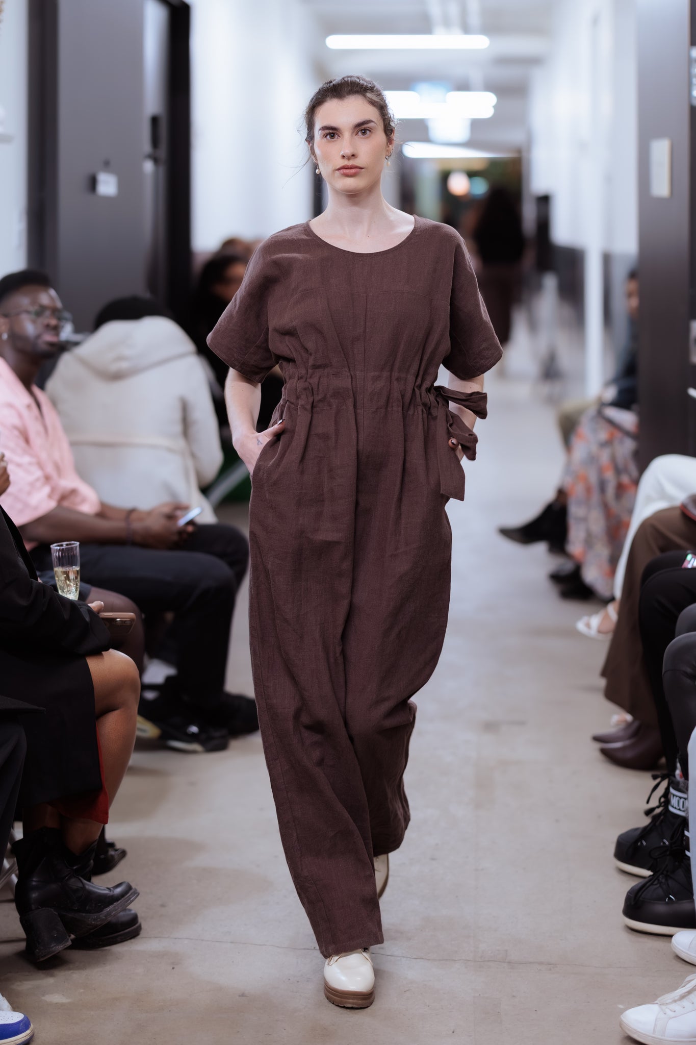 A rich Cacao brown jumpsuit crafted in a cooling linen-cotton blend, designed with an internal belt and a contemporary drop-shoulder silhouette.