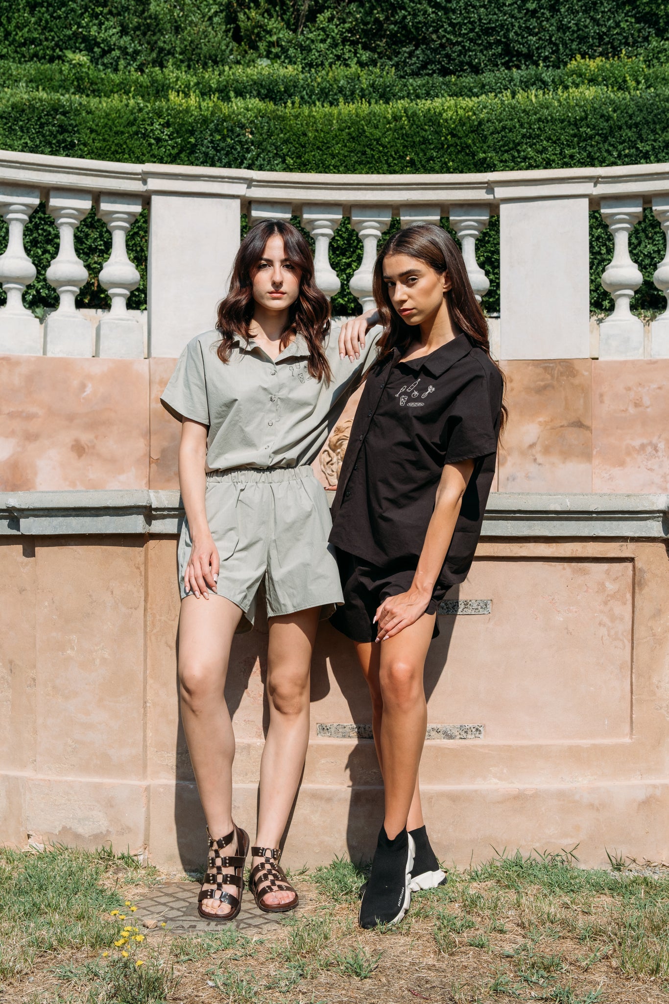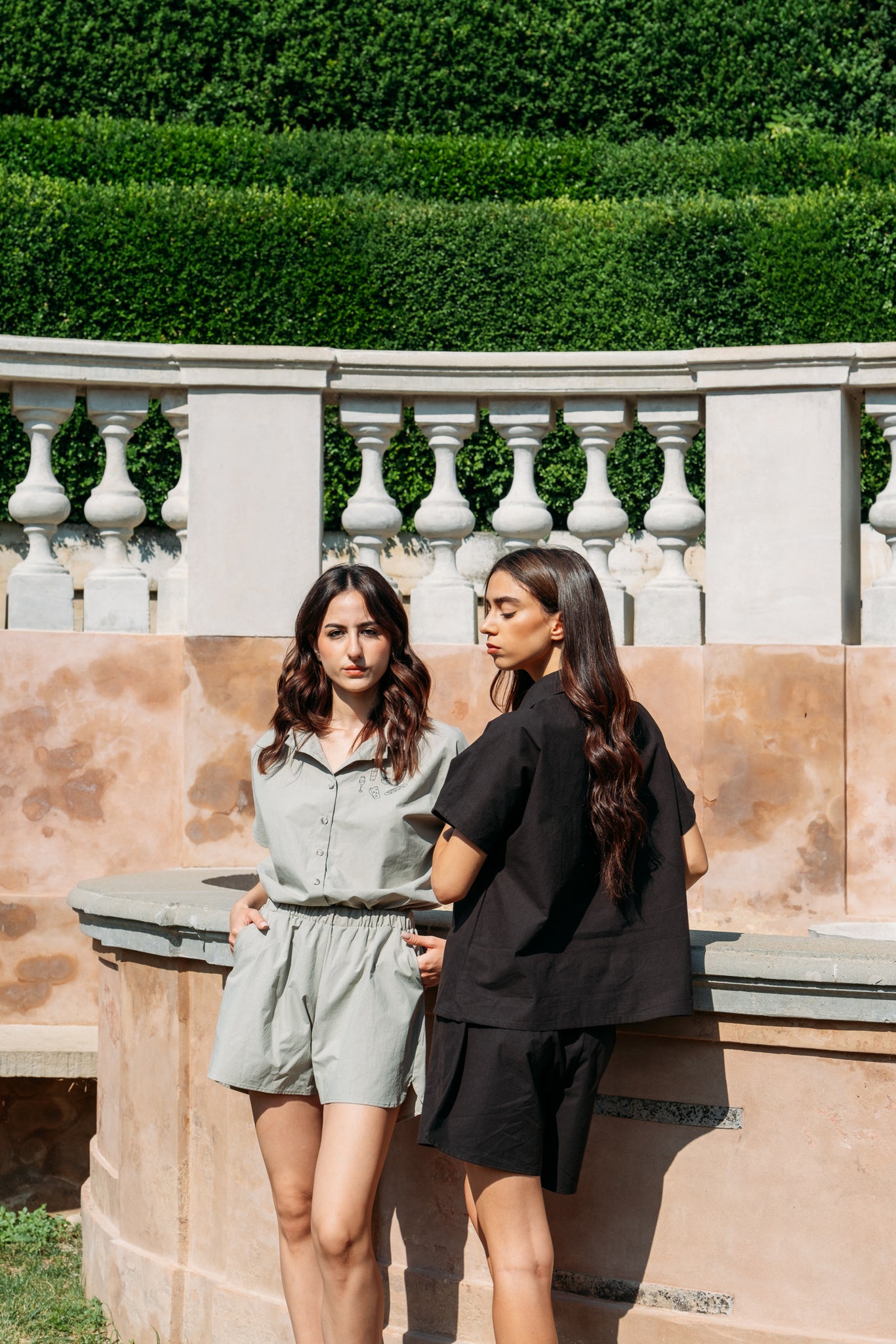 A sophisticated Pepper black button-up blouse in 100% cotton, featuring drop shoulders and exclusive Chanel x Filorama embroidery.