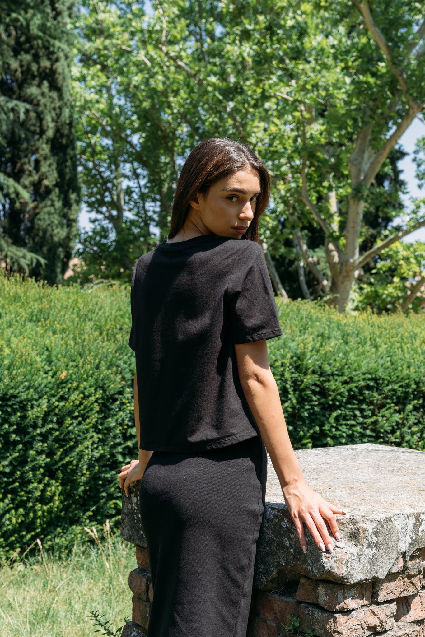 A refined, Pepper black classic t-shirt featuring a slightly cropped length and a premium jersey blend for the ultimate wardrobe anchor.