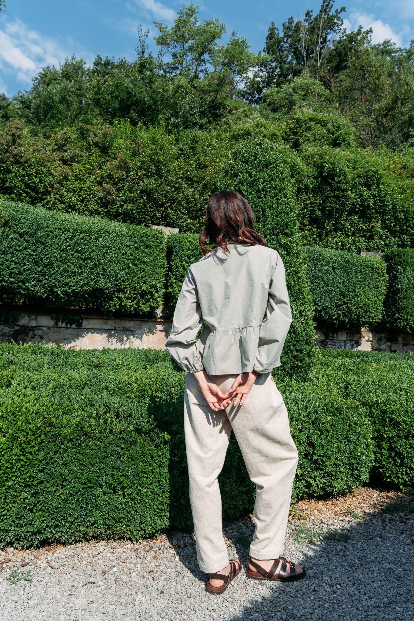 A fresh Dew green long-sleeve blouse crafted in 100% cotton, featuring a signature large collar and three front tie-closures.